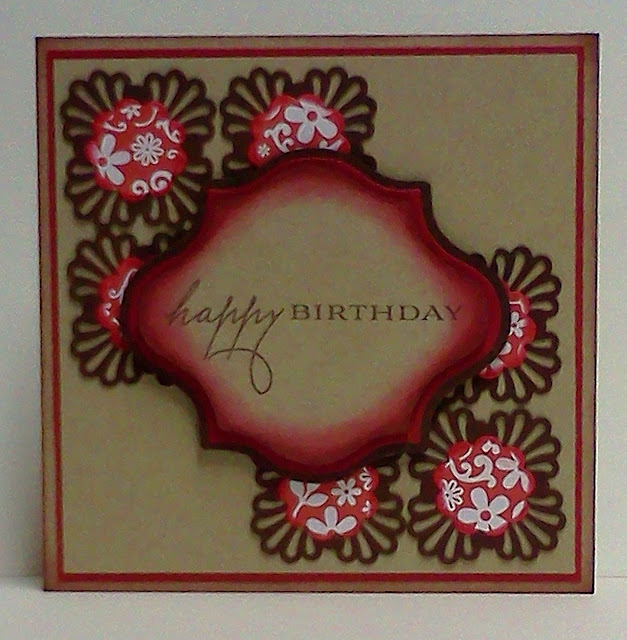 I used Martha Stewart's Deco Fan corner punch to create the brown base behind the red patterned Provo Craft Cuttlebug Scallop Circle die cuts. The kraft sentiment piece was cut using Spellbinders Labels Fourteen. I used only one of them to create the three pieces tracing the outer edge on the brown and cutting it out; the red actually was die cut; and the kraft piece was traced along the inside of the die, cut out, and ink blended around the edge with a red and then brown ink. Here are some close-ups to view.