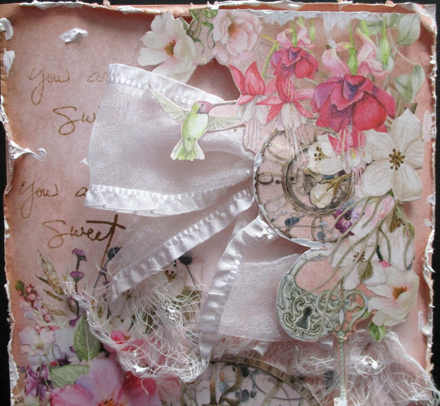 For this card we are doing something a little different. the larger clock you see at the bottom has been cut around the outer edge with a craft knife and distressed cheese cloth is stuffed just inside and adhered down. You might be able to see it better in the close up, next.