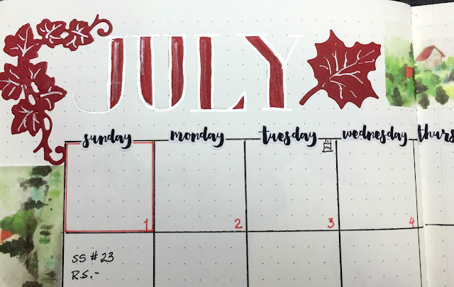 I will be at a family reunion in a week from now, when I would normally post the next month's set up in my bullet journal. For that reason I had to set up the month of July earlier so that I would have a bullet journal to use during those first 10 days of July. I did some different things in setting up the month of July, not so much the layouts, but what I used to create the July theme.